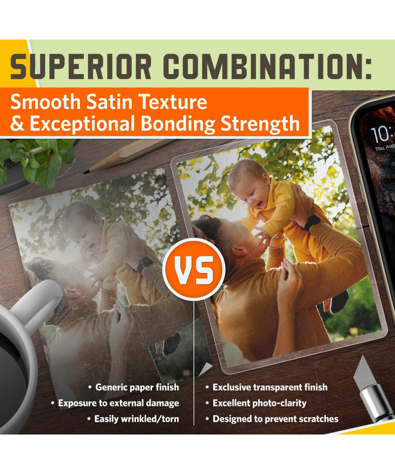 SMOOTH SATIN TEXTURE - soft-to-touch, anti-scratch, fingerprint proof finish of matte laminating sheets creates a slick, modern look; exceptional photo-transparency enhances ink colors of business card laminating pouches; anti-glare textured card laminate pouches coating keeps off reflections and halos
